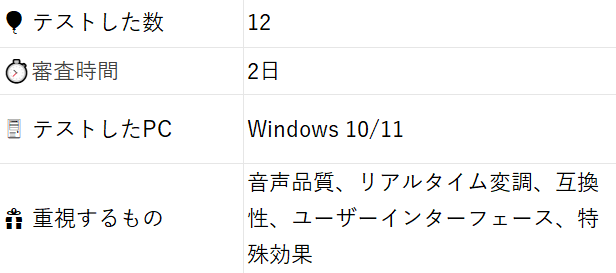| 🕵️♂️評価した点 | 音質、カスタマイズ、リアルタイム性、ラグ、UI |